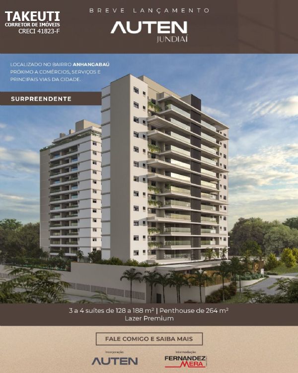 lançamento auten jundiai - anhangabau - jundiai. agende sua visita antecipadamente e venha conhecer nosso plantão e nosso lindo decorado. agendamento de visitas com corretor takeuti da empresa fernandez mera / apartamentos de:128,51m2 / 131,14m2 / 188,62m2 / penthouse: 264,54m2 / chegando ao plantao, para seu melhor atendimento, procure pelo corretor takeuti e-mail: takeuti.corretorimobiliario@gmail.com / plantao de vendas: av dr adilson rodrigues, 2542 jd samambaias. /no plantão procure corretor takeuti da fernandez mera. creci-41823-f