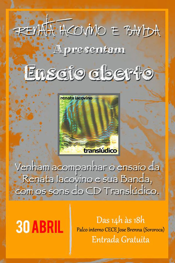Renata Iacovino e Banda promovem um ensaio aberto no Complexo Educacional Cultural e Esportivo José Brenna (Sororoca), neste sábado (30), a partir das 14h. Com repertório diversificado, o grupo apresenta os trabalhos autorais “Translúdico” de 2015 e “Inverno” de 2010, além de “covers” de grandes nomes da MPB, como Caetano Veloso, Tim Maia e Ângela Rô Rô.